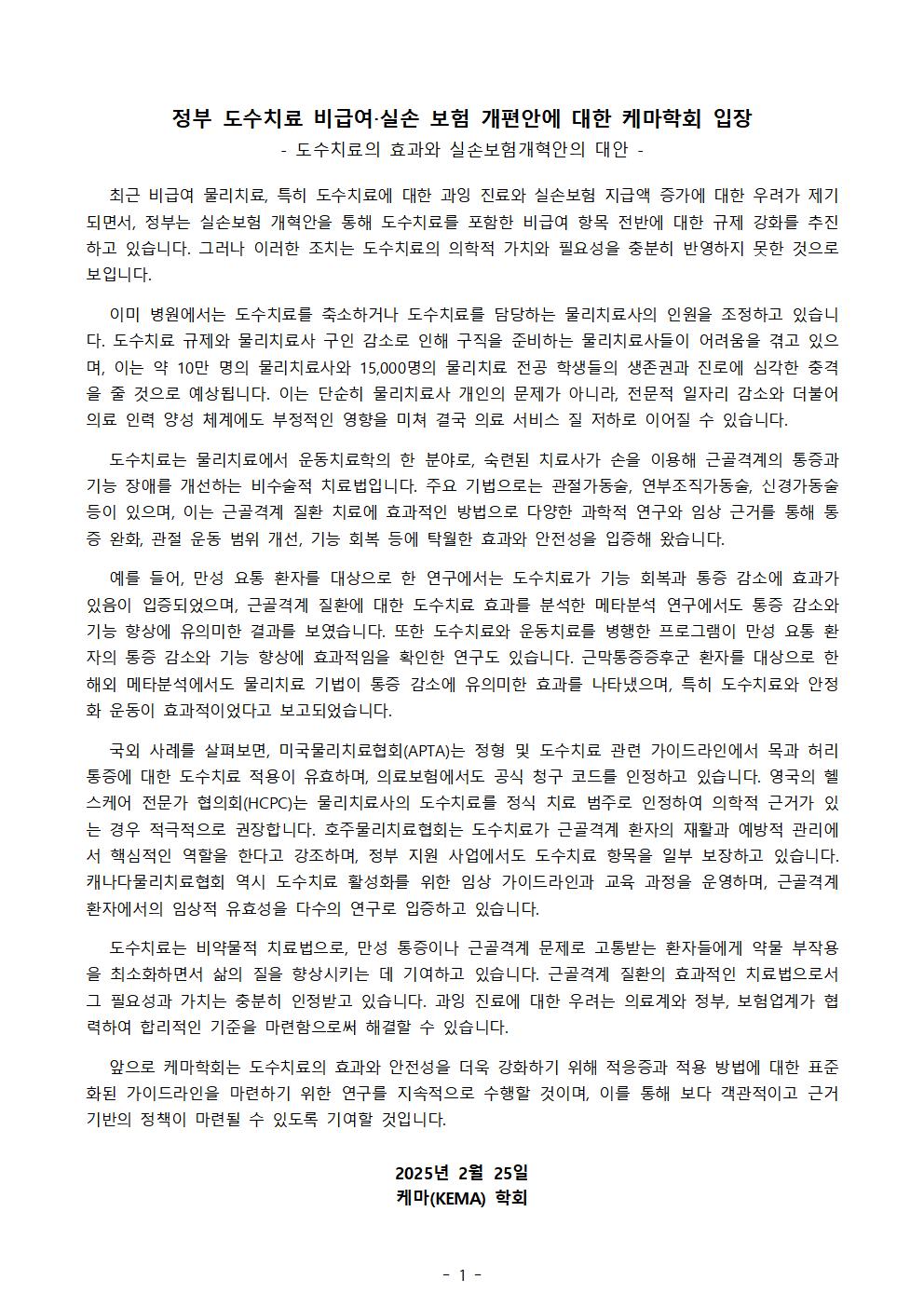 KEMA학회 입장문 (도수치료 비급여,실손보험 개편안에 관한)