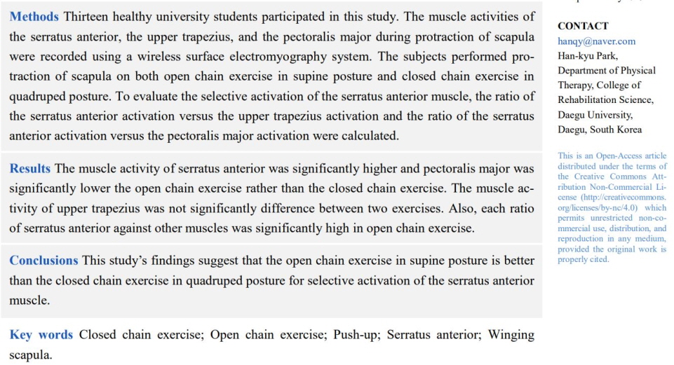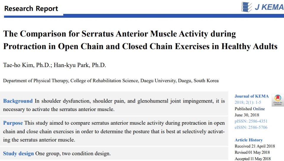 The Comparison for Serratus Anterior Muscle Activity during Protraction in Open Chain and Closed Chain Exercises in Healthy Adults