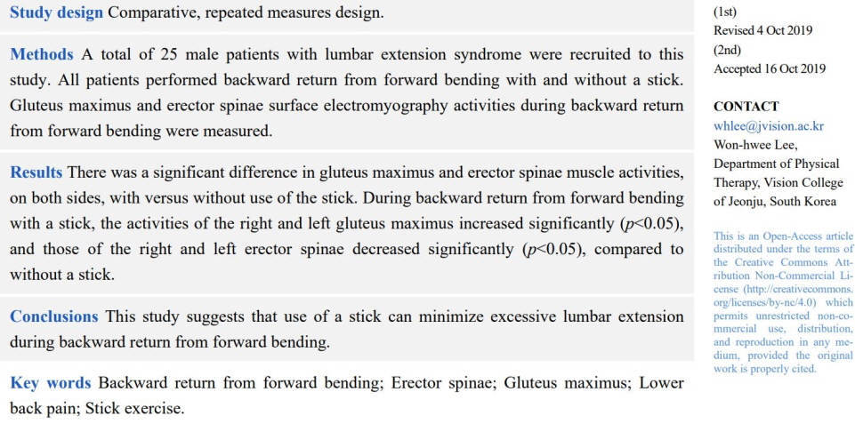 Effects of Exercise Using a Stick on Muscle Activity of Gluteus Maximus and Erector Spinae during Backward Return from Forward Bending