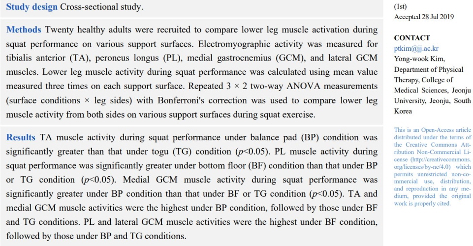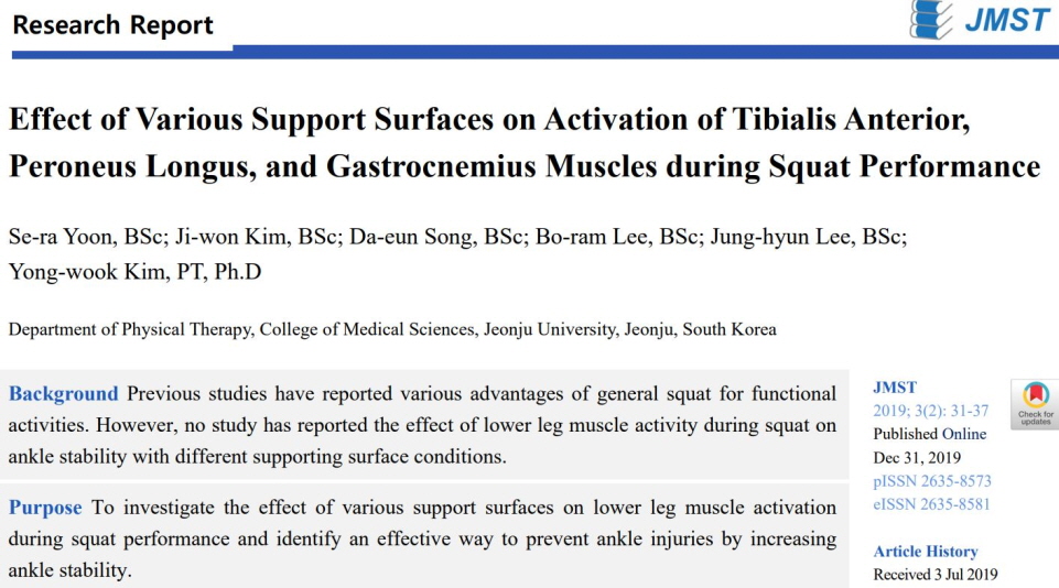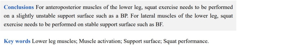 Effect of Various Support Surfaces on Activation of Tibialis Anterior, Peroneus Longus, and Gastrocnemius Muscles during Squat Performance